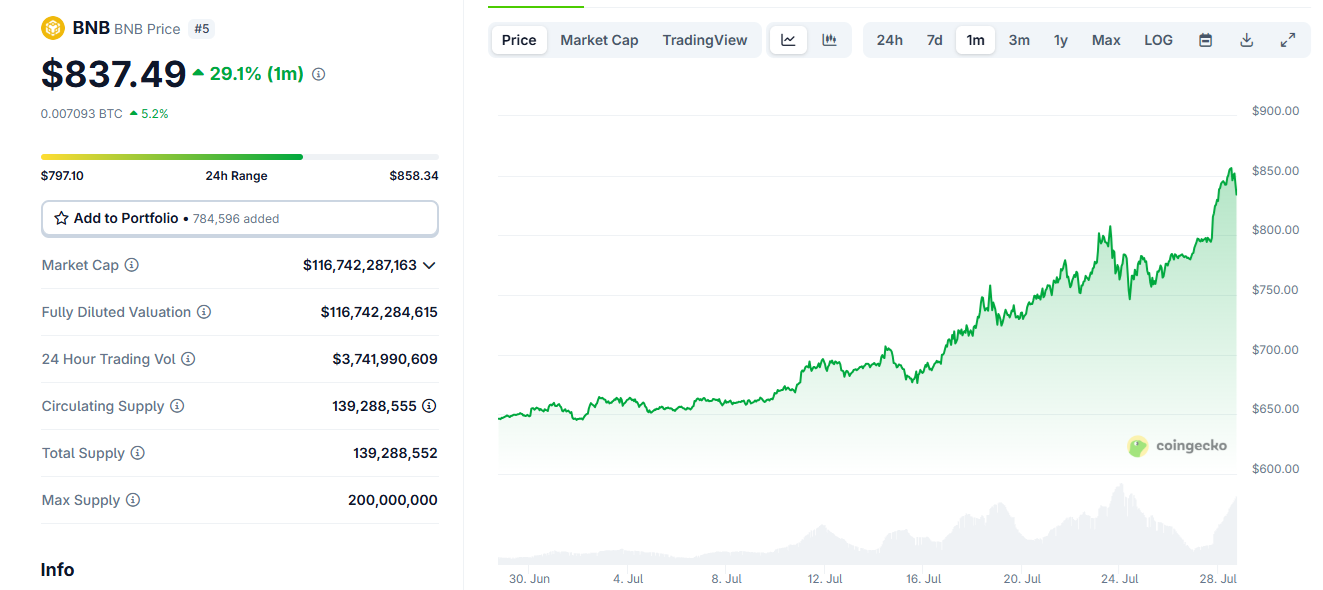 BNB, the native token of BNB Smart Chain, peaked at $858.34, with trading volumes jumping to $3.7B. The token has climbed relentlessly in the past month, starting its rally at around $646.