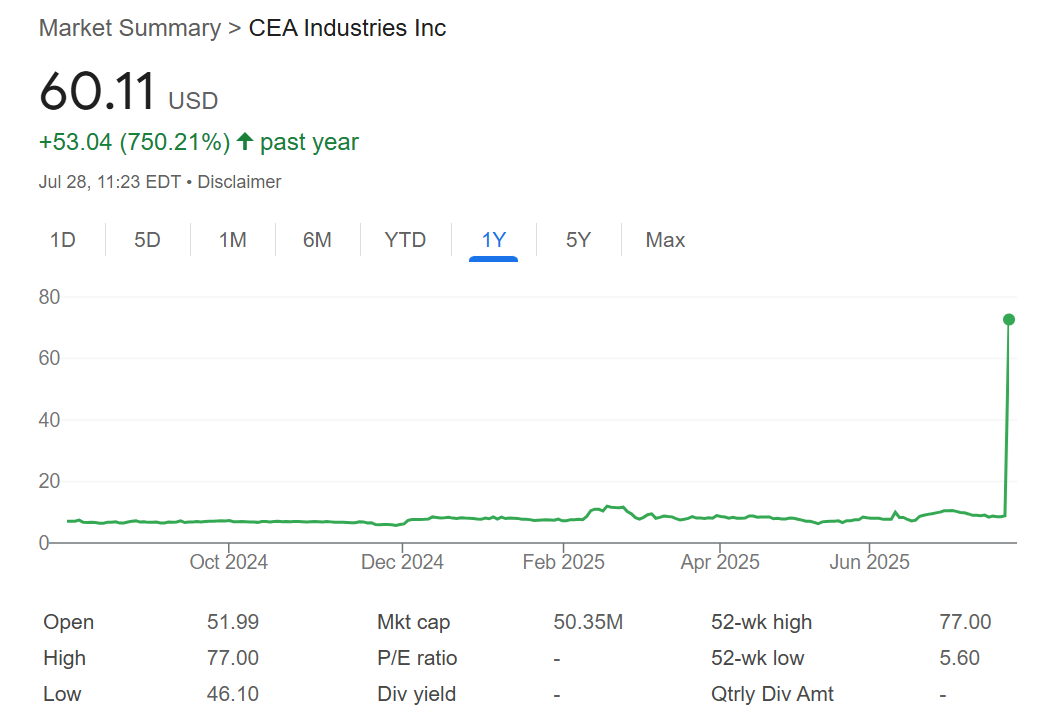 One of the biggest treasuries announced is the upcoming purchase of CEA Industries (VAPE), a Nasdaq-listed company. The fundraising for the treasury is done with the assistance of 10X Capital, as well as the leadership of Yzi Labs. The PIPE fundraising effort has drawn in 140 subscribers, including Yzi Labs, Pantera Capital, as well as the founders of BitFury.
