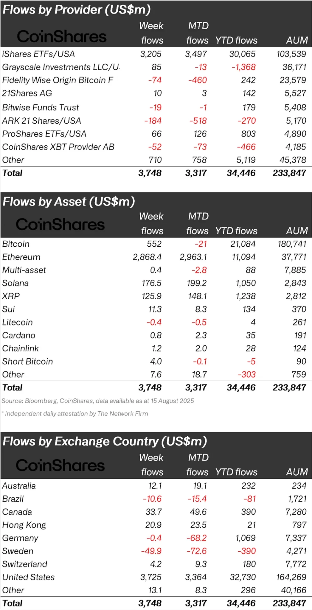 Cryptocurrency investment products saw inflows of $3.75 billion, the fourth-highest on record. This pushed AUM to an all-time high of $244 billion.