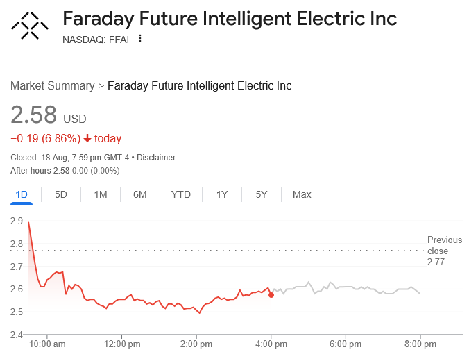Faraday Future Intelligent Electric (FFAI) saw a brief spike as the markets opened on Monday, but eventually closed the trading session at $2.58, losing a week of gains, according to Google Finance.