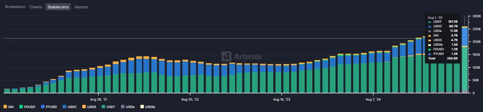 However, roughly 99.8% of the supply is represented by dollar-pegged stablecoins, according to Artemis data. Tether USD (USDT) dominates the market, with a 61% market share.