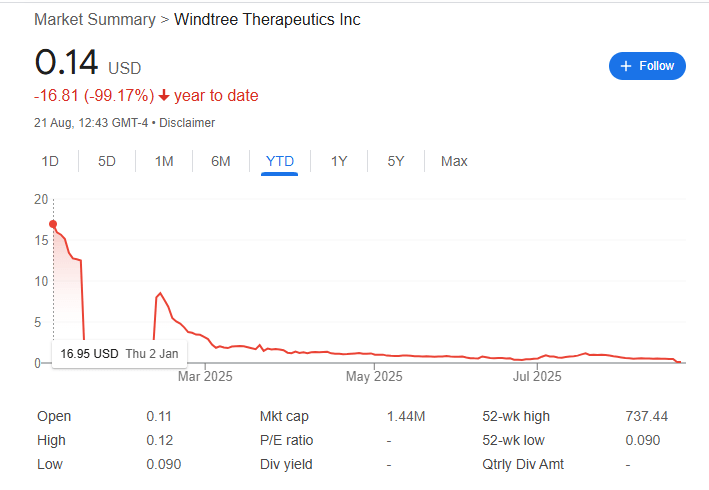 A stock is considered non-compliant if its closing price remains below the $1.00 threshold for 30 consecutive trading days, putting it at risk of being removed from the exchange. Windtree’s stock had been trading largely below this threshold since May, making its delisting a growing possibility.