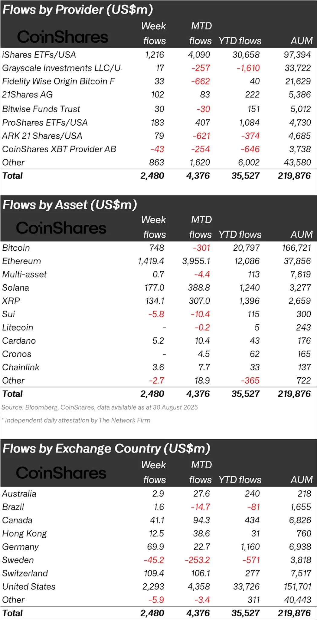“Last week, $2.48 billion in inflows into cryptocurrency investment products increased to $4.37 billion in August and $35.5 billion since the beginning of the year.”