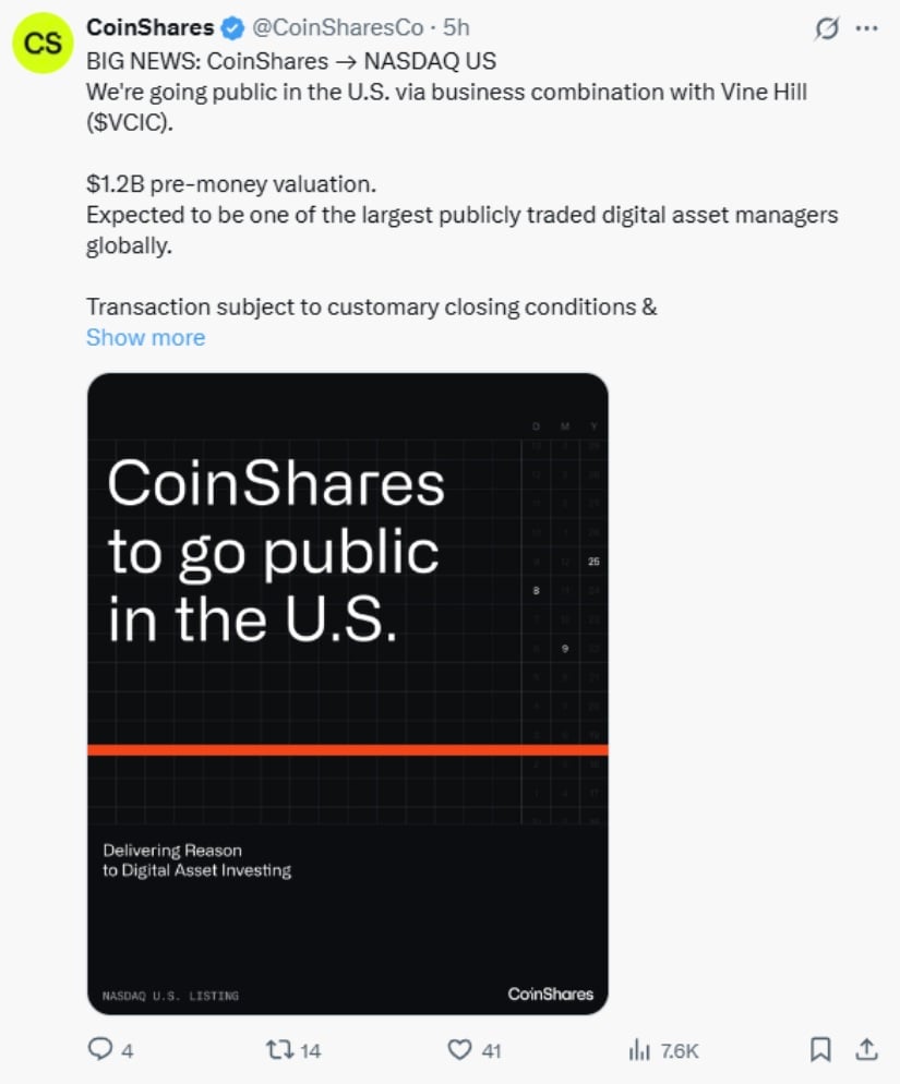 Vine Hill Capital completed its own $220 million public offering in September 2024. The SPAC’s CEO, Nicholas Petruska, praised CoinShares for having “market leadership, a proven, scalable business model, a massive and expanding addressable market and a team with the proven ability to execute.”