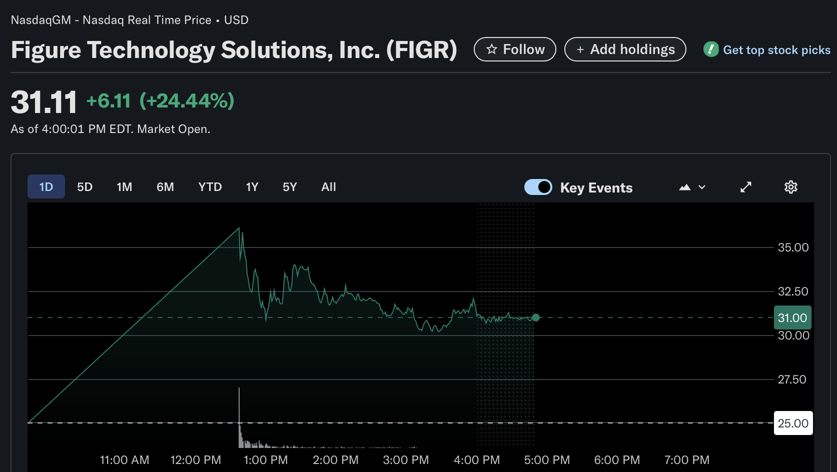 In another public listing, shares of Figure Technologies debuted on Nasdaq Thursday, with its shares jumping 24.4% in the first trading day.