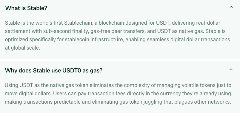 “Using USDT as the native gas token eliminates the complexity of managing volatile tokens just to move digital dollars,” Stable’s FAQ says.