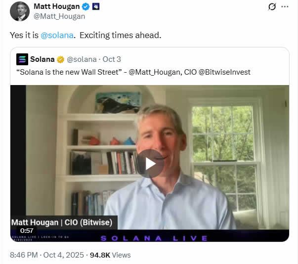 “I think Solana is the new Wall Street,” said Hougan, speaking with Solana Labs’ Akshay Rajan on Oct. 2. He added that the Wall Street audiences consider Bitcoin (BTC) “very ephemeral” and “hard to get their heads around.”