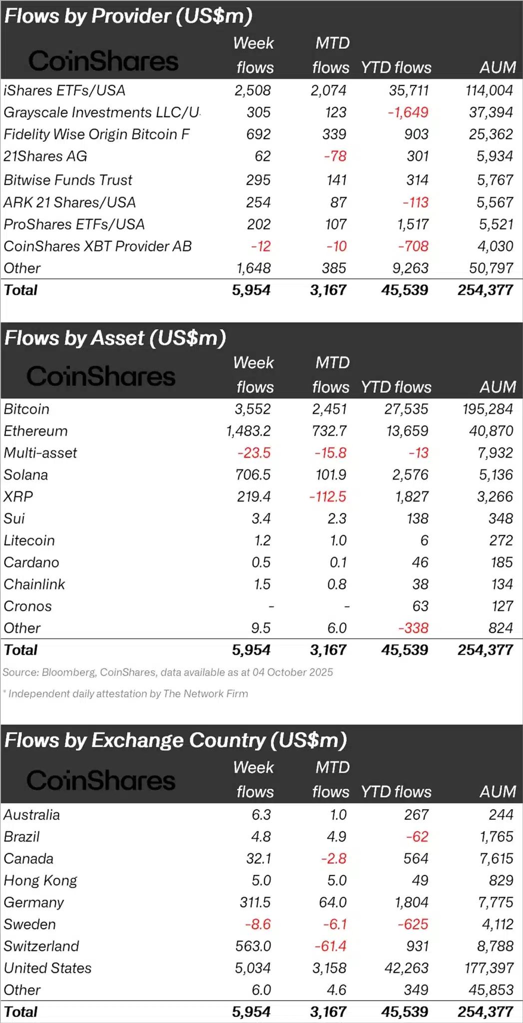 Cryptocurrency investment products attracted $5.95 billion in investment last week due to the delayed response to weak employment data and concerns about the stability of the U.S. government.