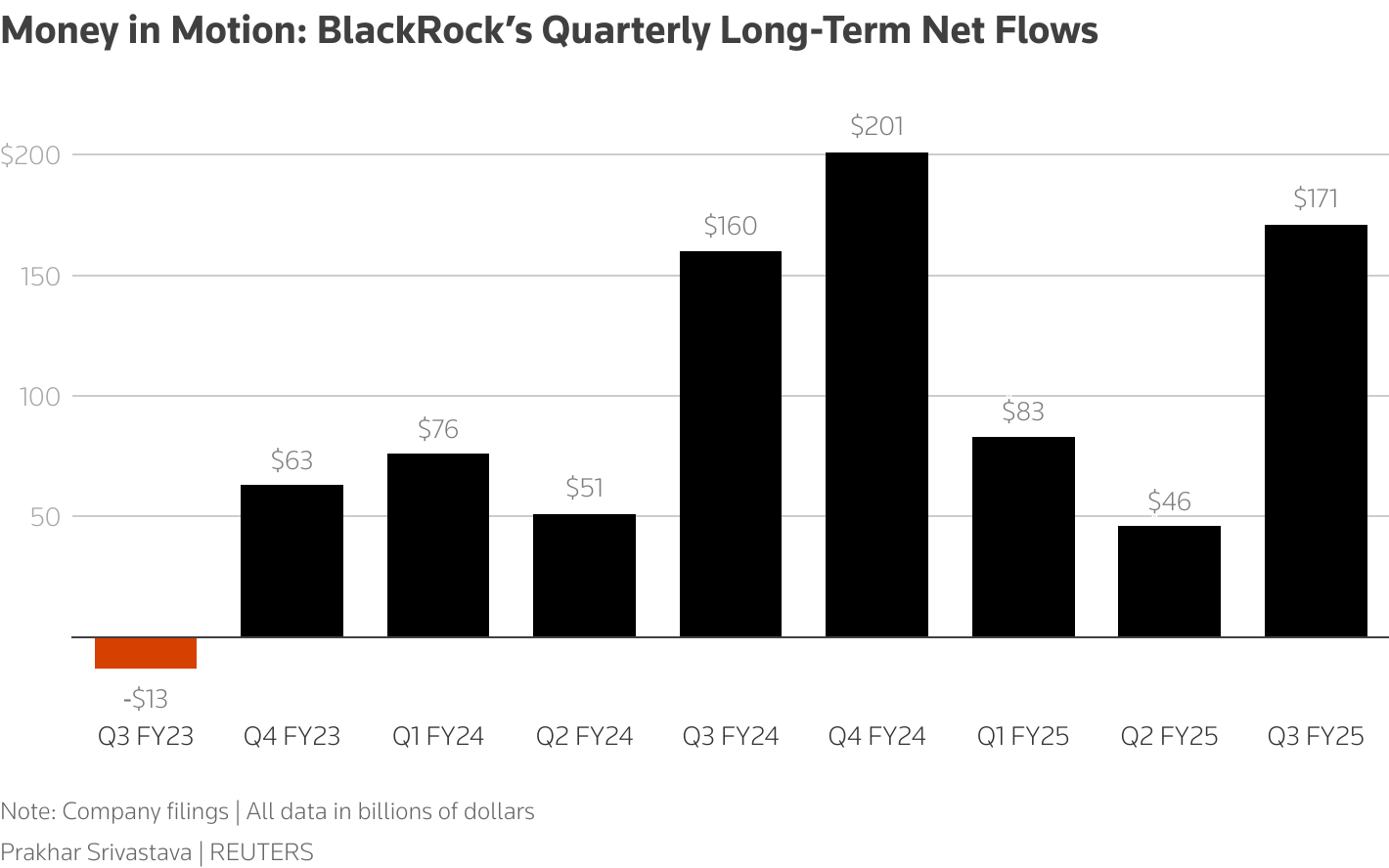 #BlackRock is eating the world! The world's largest asset manager recorded net inflows of $205bn in Q3 2025 as the company expanded its footprint in private credit and alternative assets. BlackRock’s total assets under management hit a record of $13.5 TRILLION as markets surged. pic.twitter.com/QFkR5G8aqw