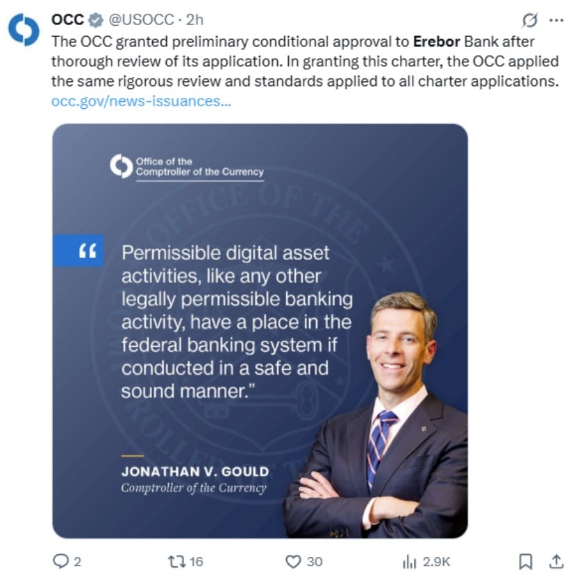 This marks the first new bank charter approved under OCC Comptroller Jonathan Gould, who took office in July 2025. The decision signals a major shift in how federal regulators view digital assets and crypto-focused banking.