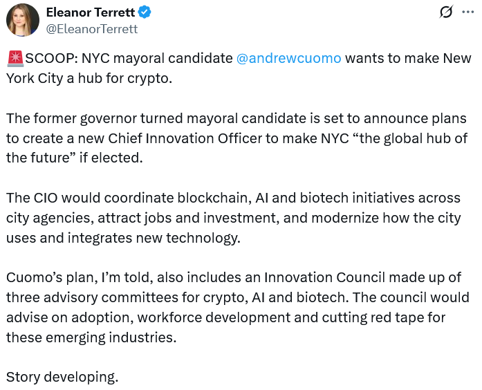 Former New York governor Andrew Cuomo is reportedly betting big on crypto and AI as part of his bid to return as the city’s next mayor.