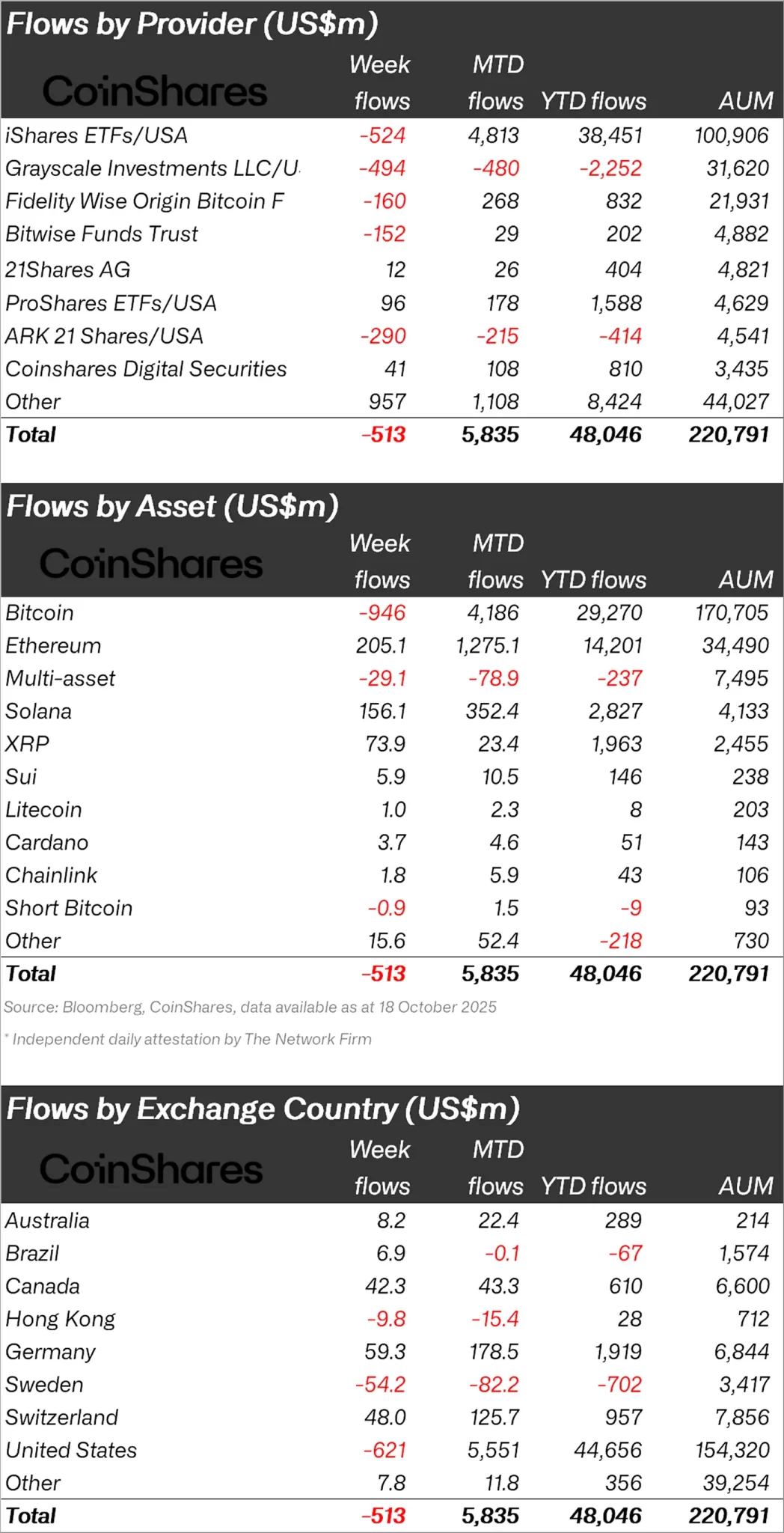 Cryptocurrency investment products saw $513 million in outflows last week following the liquidity surge on October 10, but ETP investors largely shrugged it off.