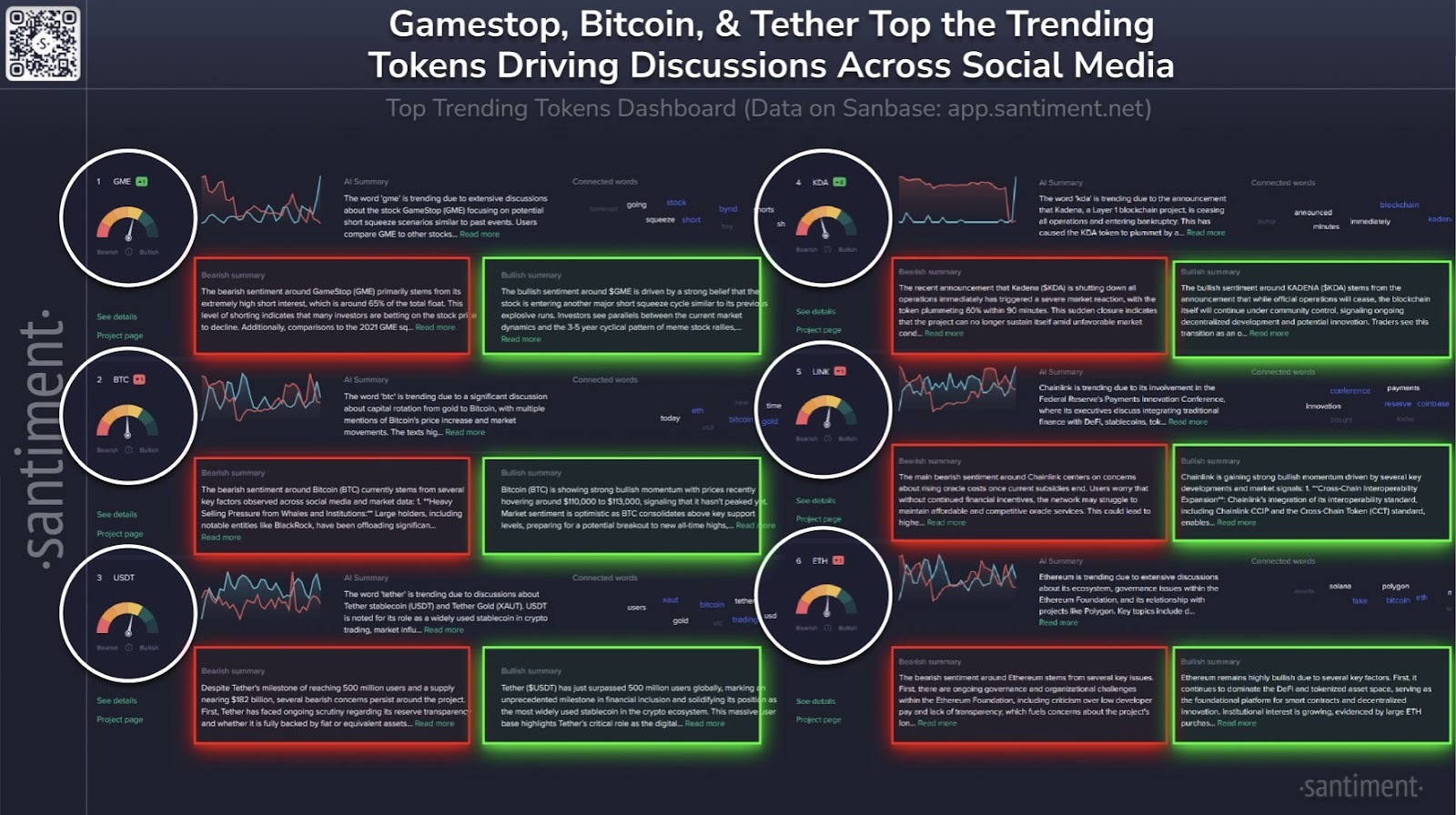Market intelligence and analytics platform Santiment has revealed that GameStop, Bitcoin, Tether, Chainlink, and Ethereum are the most trending assets in social metrics this week.