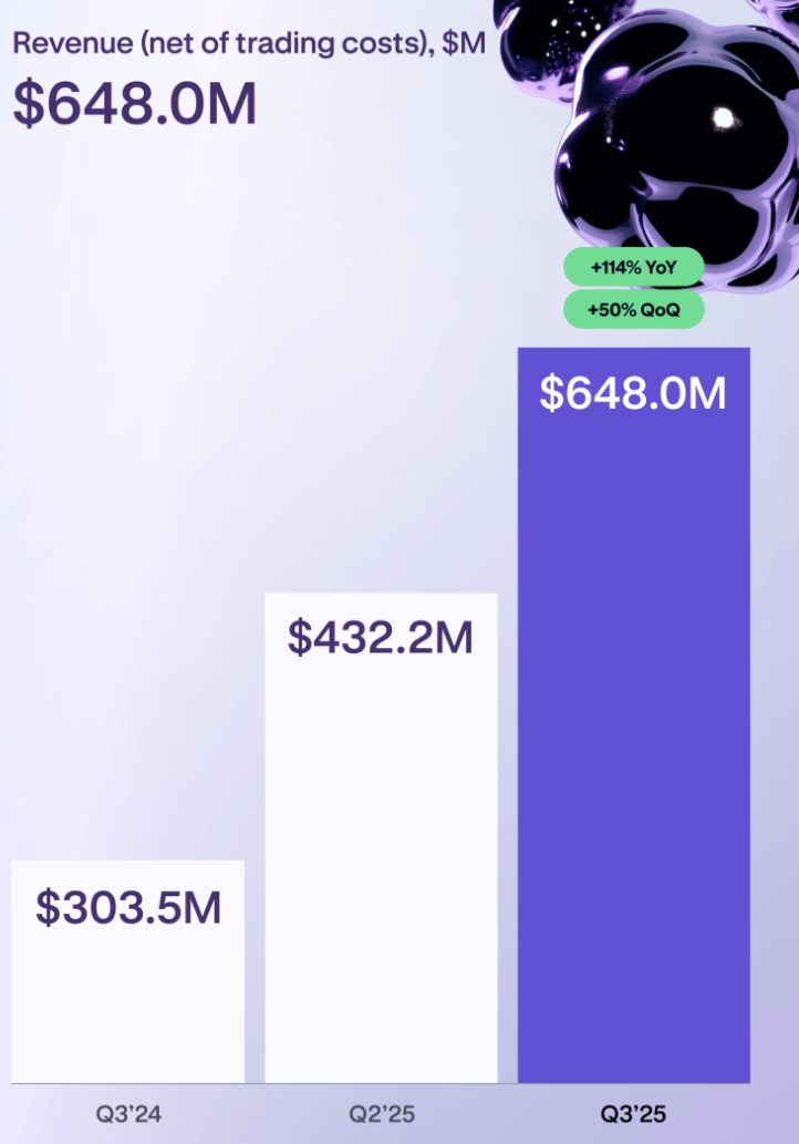 Kraken reported $648 million in revenue for the third quarter of 2025, up 114% from a year earlier, which the company described as its strongest financial performance to date.