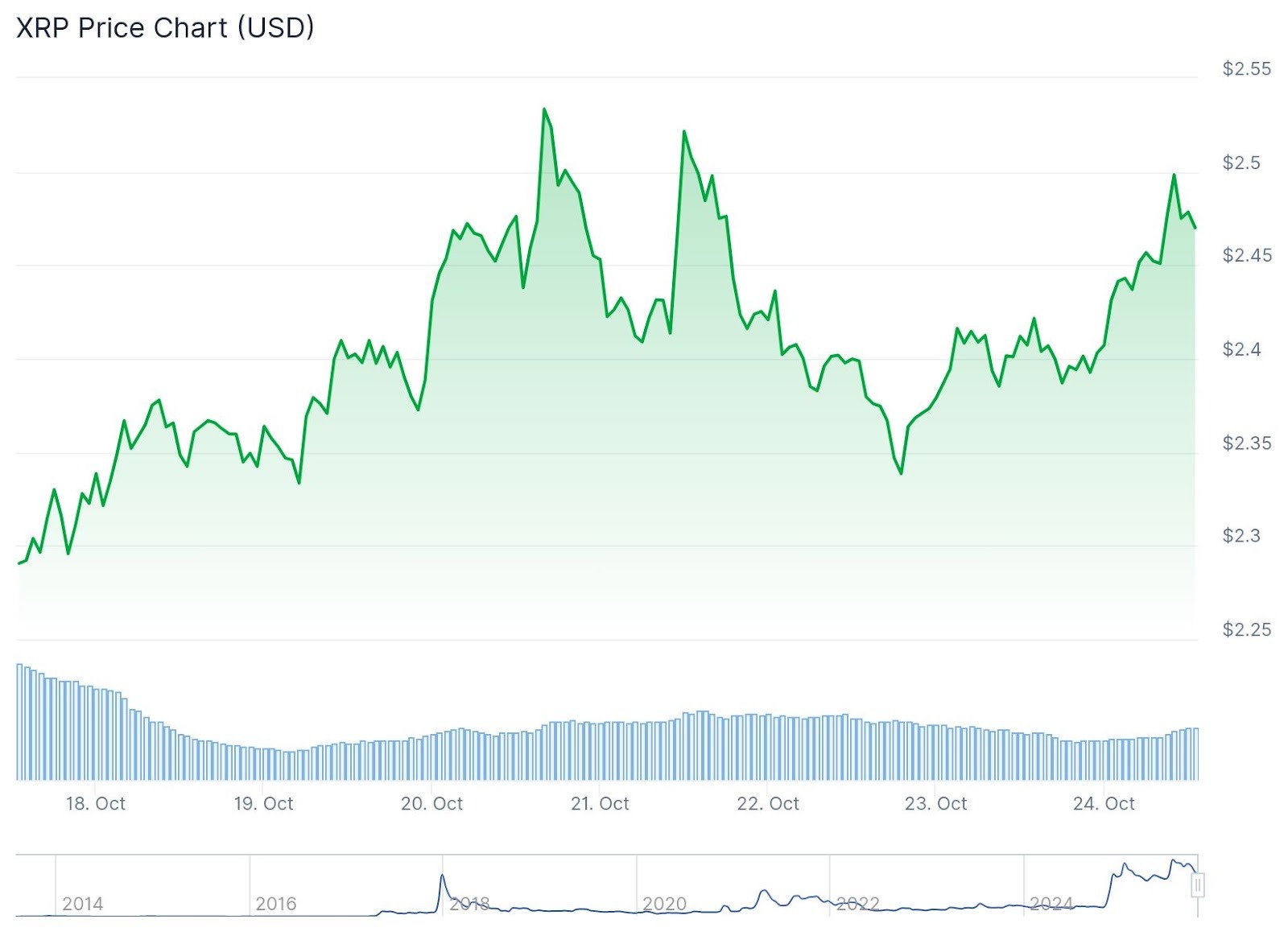 XRP is trading around $2.50, up about 5% on the day and 8% over the past seven days, after suffering losses most of last week amid a broader market downturn, according to The Defiant’s price page. It is currently the fifth-largest digital asset with a market capitalization of over $148 billion.