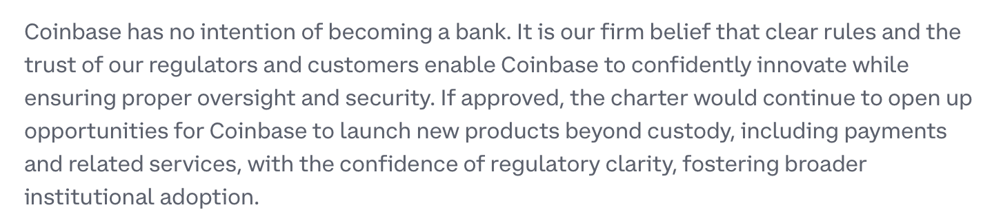 Coinbase filed a similar application with the agency on Oct. 3. In a blog post, the company said that while it “has no intention of becoming a bank,” the charter would enable the launch of new products “with the confidence of regulatory clarity.”