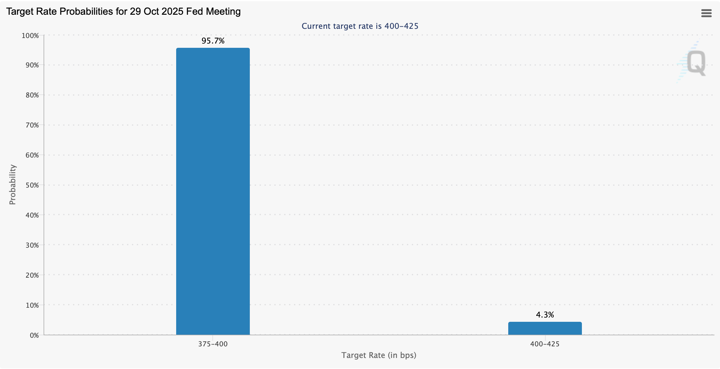 CME’s FedWatch tool shows a 95.7% probability of a quarter-point cut and 4.3% odds of no change. -