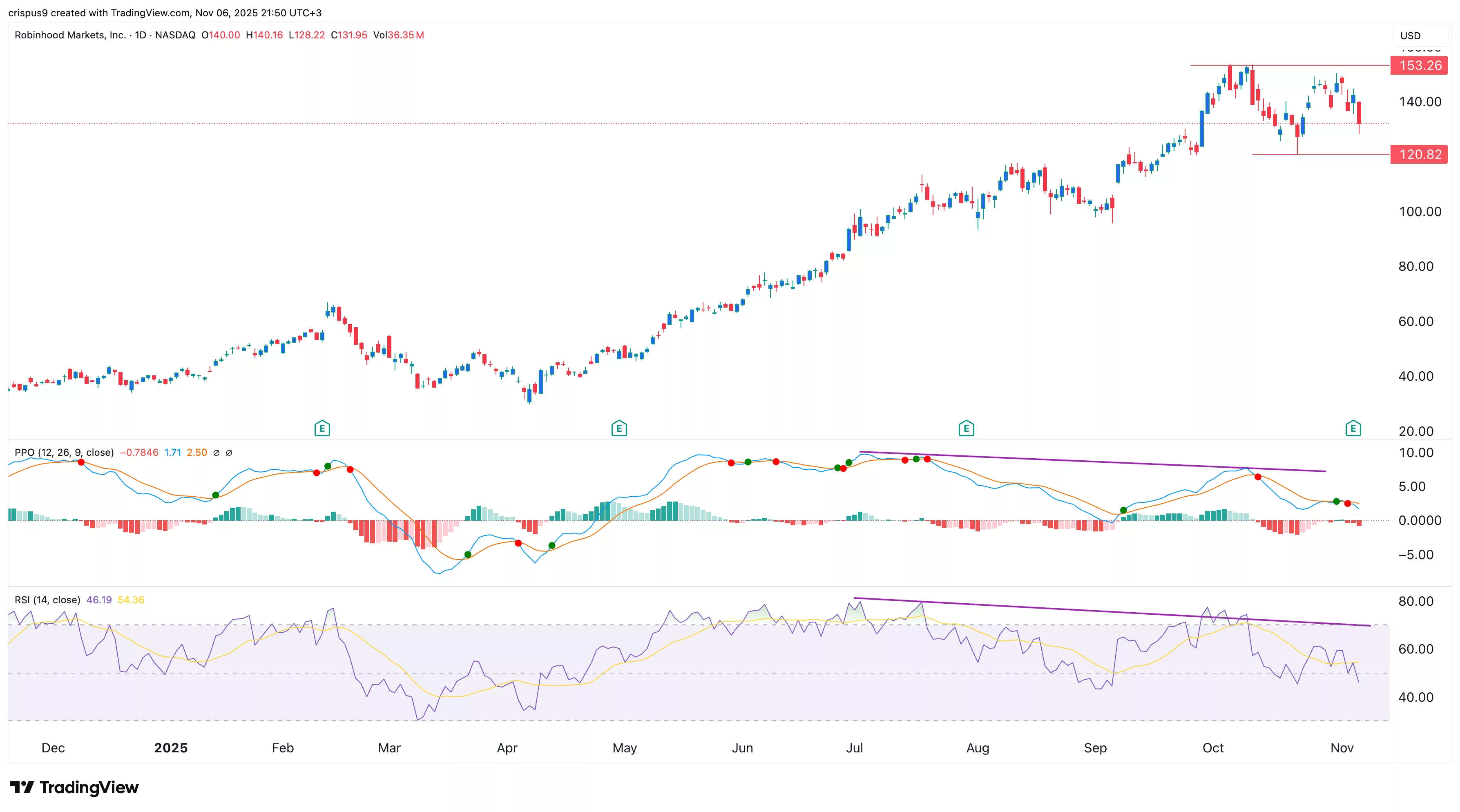 Technicals also explain why the Robinhood stock price plunged after earnings. The daily chart shows that the stock formed a double-top pattern at around $153 and a neckline at $120. This pattern often leads to a strong bearish breakout.