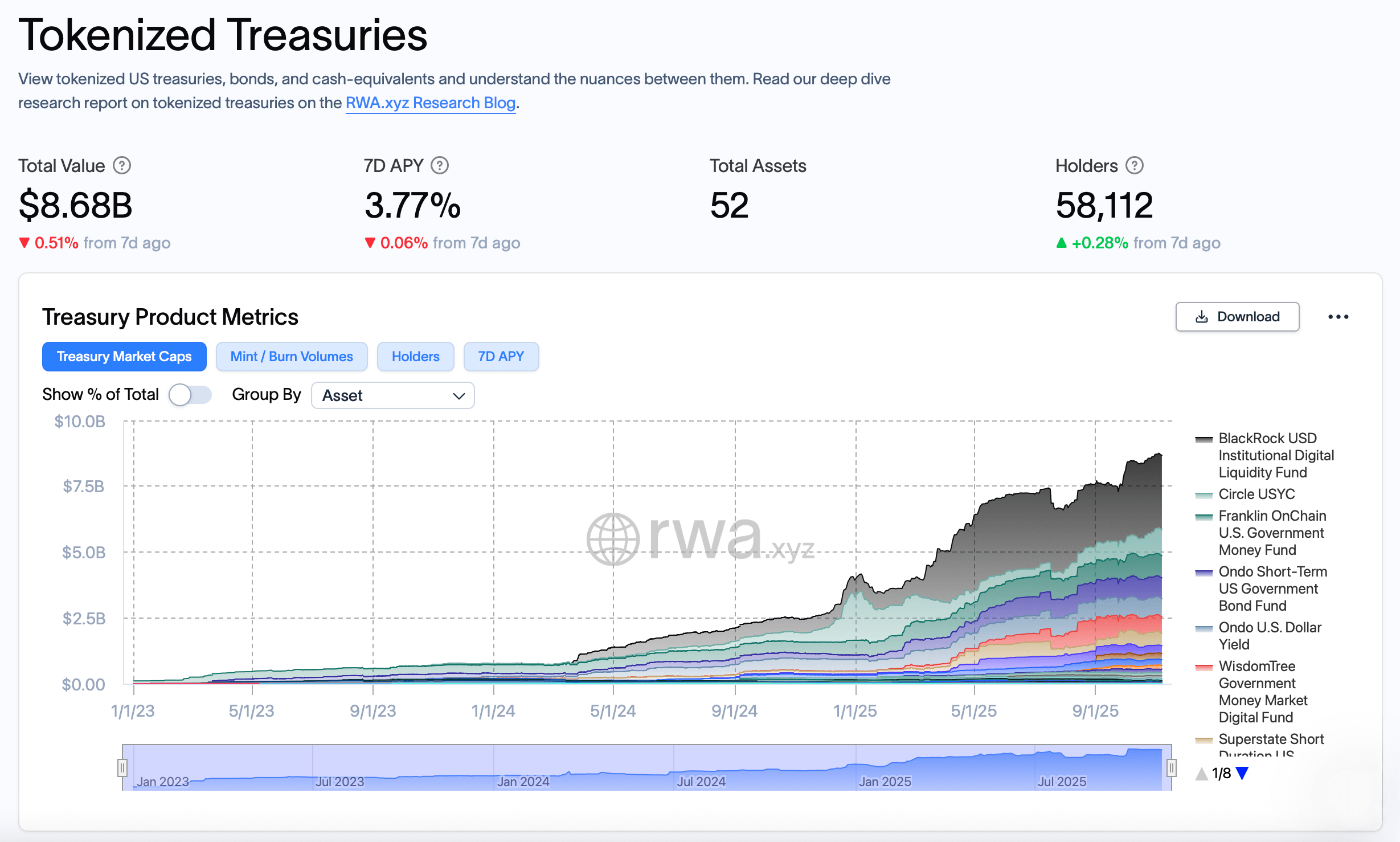 On the government-debt side, tokenized Treasuries are holding steady at $8.68 billion across 52 products, pulling a seven-day APY near 3.77%. There are 58,112 holders now (up a modest 0.28% on the week), and the leaderboard looks familiar: Blackrock’s BUIDL leads with roughly $2.82 billion, Circle’s USYC follows near $986 million, and Franklin Templeton’s BENJI trails close behind at $845 million.