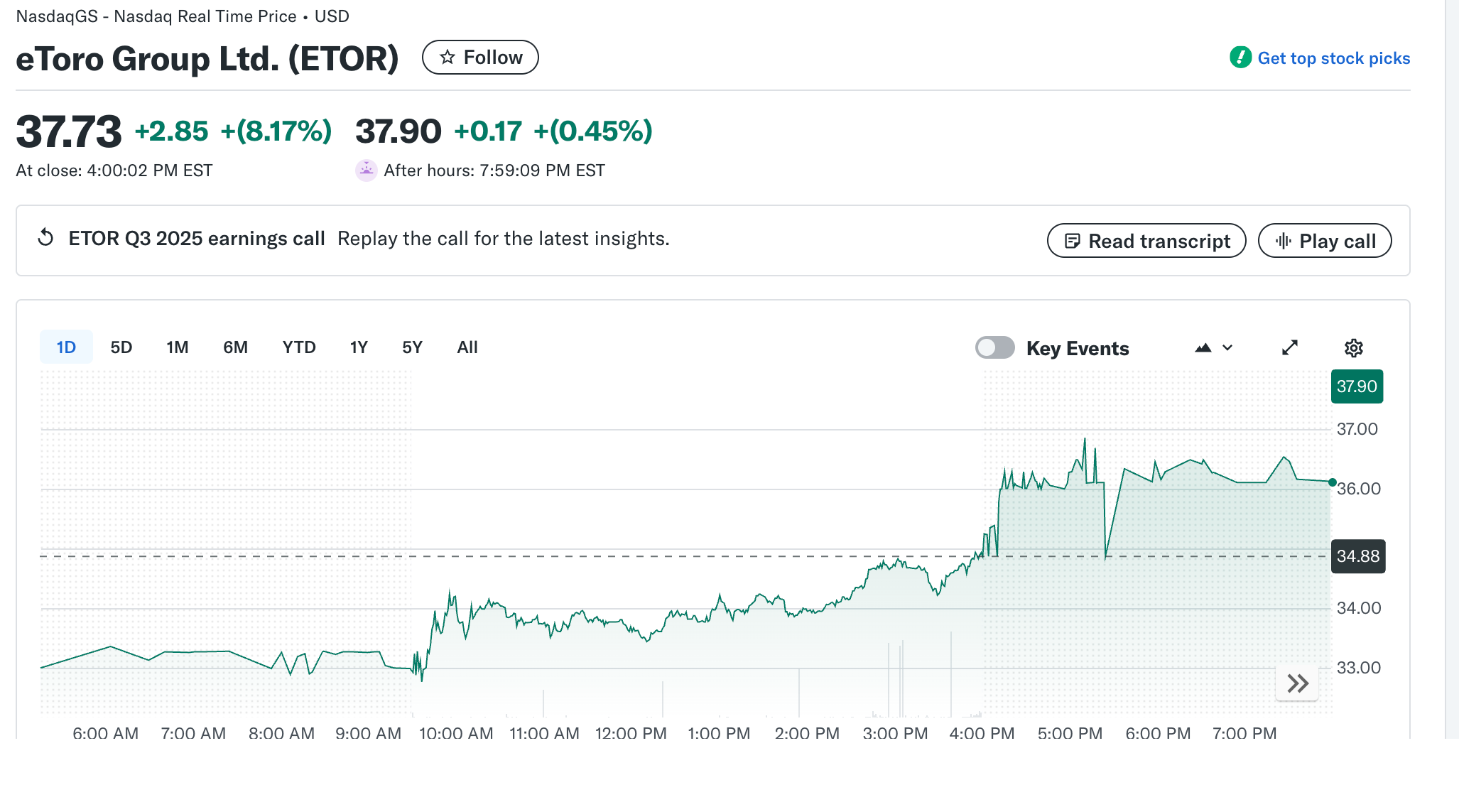 eToro launched AI-powered strategy tools, 24/5 trading for major US indices, and a premium subscription tier (eToro Club). A $150 million share repurchase program—$50 million via accelerated buyback—was also unveiled. Shares rose 8% in early trading following the November 10 release.
