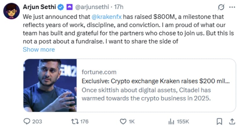 “This investment represents long-term conviction in Kraken’s mission to build trusted, regulated infrastructure for the open financial system,” said Arjun Sethi, Co-CEO of Kraken, in the company’s official announcement.