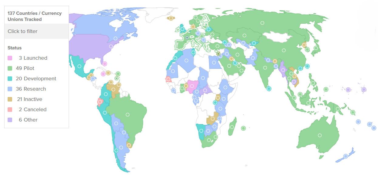 Globally, 3 countries launched CBDCs, 49 testing, 20 developing, 36 still researching digital currencies.