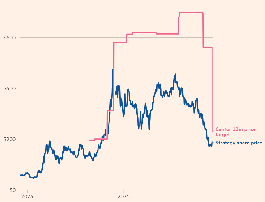 Cantor Fitzgerald reportedly lowered its 12-month price target on Strategy stock by 60%, adjusted to $229 from $560, according to a Thursday analyst note seen by the FT.