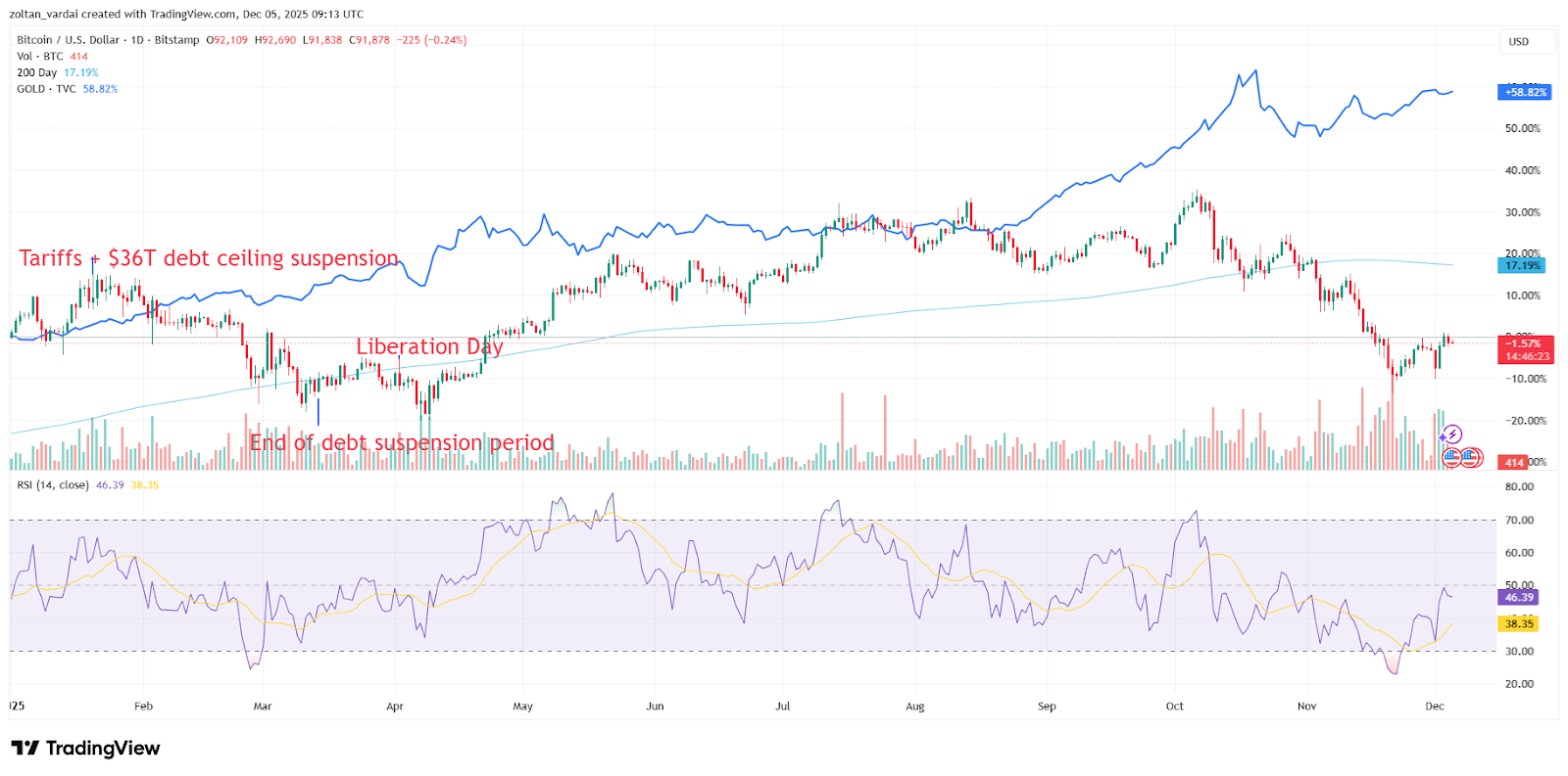 Since the beginning of 2025, gold’s price has risen 58%, outperforming Bitcoin’s 1.5% YTD decline, according to TradingView data.