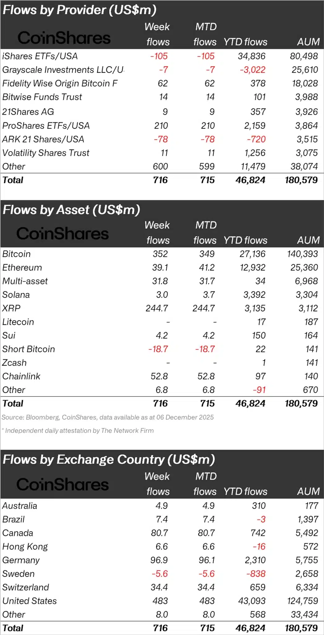 “Last week, $716 million in inflows into cryptocurrency investment products increased, bringing total assets under management to $180 billion, but this figure is still well below the all-time high of $264 billion.”