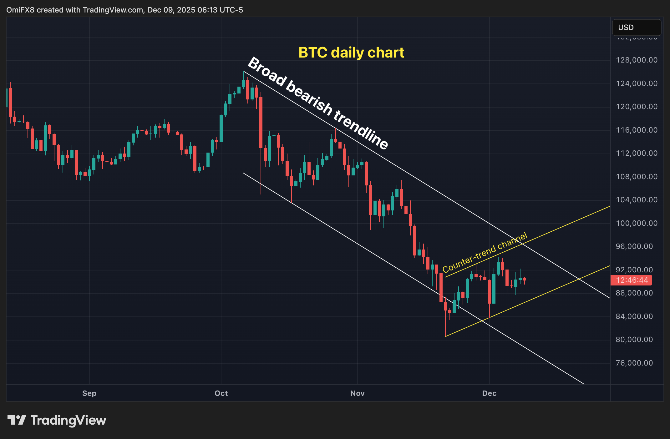 • BTC has printed higher lows and highs since Nov. 21, carving out a mini-ascending channel within a broader downtrend.
