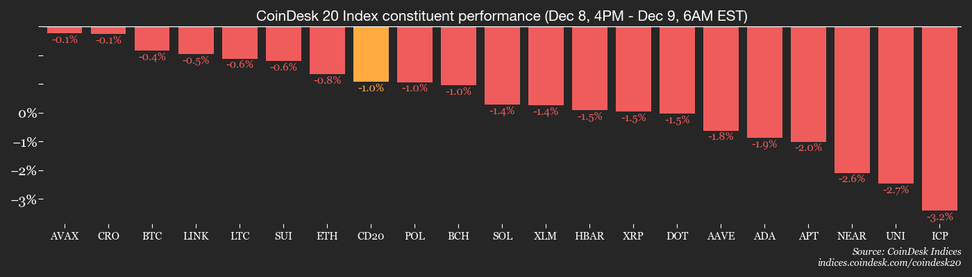 The crypto market lacks clear direction. Bitcoin BTC$90,576.06 is still in its boring range-play between $90,000 and $95,000, and there's little cheer in the broader market, as evidenced by over 2% declines in the CoinDesk 20 (CD20) and CoinDesk 80 (CD80) indexes. ZEC is the only major token to have gained more than 3% over 24 hours.