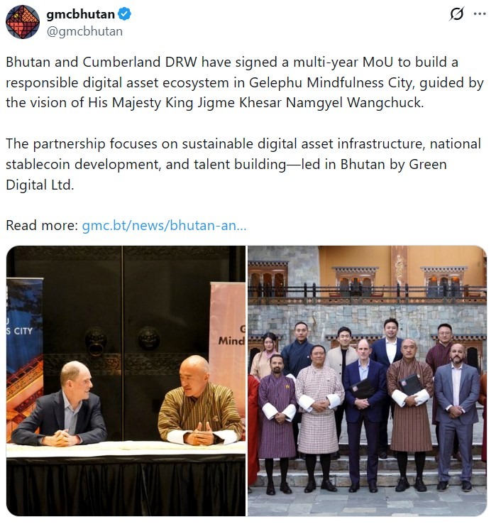 Bhutan signed a multi-year memorandum of understanding (MoU) with crypto market maker Cumberland DRW to collaborate on building digital asset infrastructure in Gelephu Mindfulness City (GMC), deepening the country’s long-term, sustainability-focused crypto strategy.