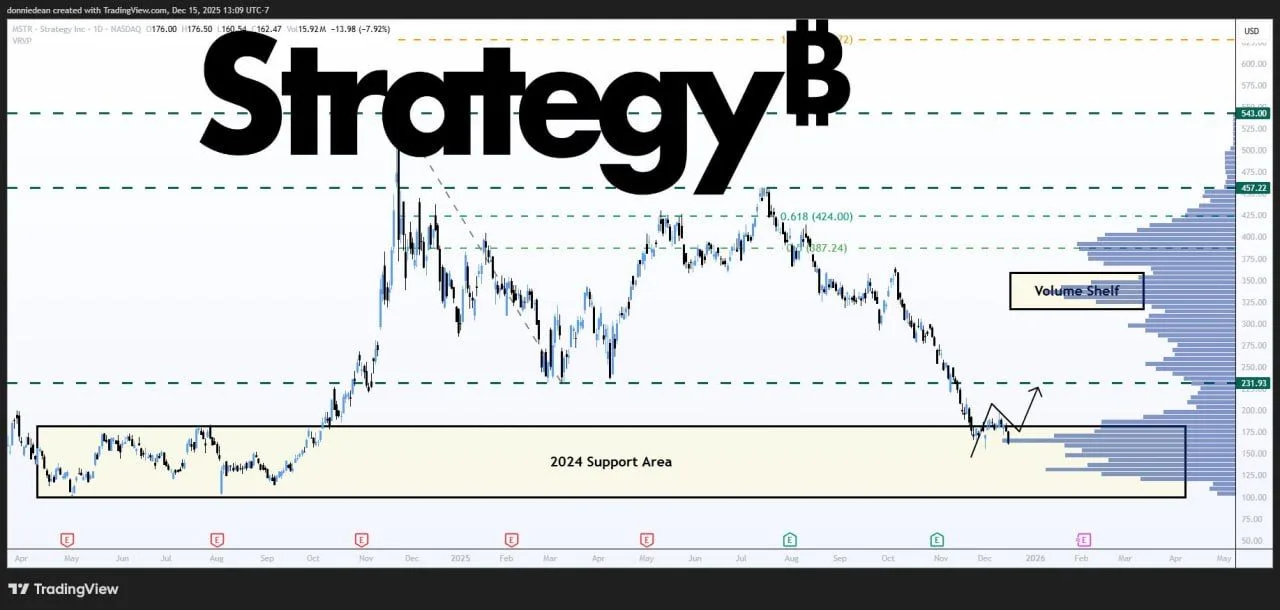 A TradingView chart shared by trader Donald Dean on X showed Strategy Inc. (MSTR) trading inside a broad support area first established in mid 2024, as the stock stayed in a lower range after months of decline. Dean wrote that MSTR is “churning in the support area” and set a price target of $340, pointing to a visible “volume shelf” on the chart.