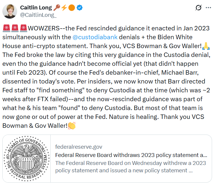 Caitlin Long, the CEO of the crypto‑focused Custodia Bank, applauded the move in an X post on Wednesday, explaining the 2023 guidance was why her institution’s application for a master account was previously denied.