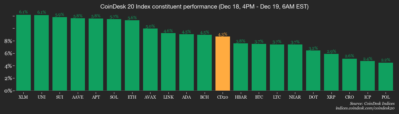 Other cryptocurrencies also advanced. Ether ETH$2,958.35 added 3.4% in the last 24 hours, though major altcoins including BNB and SOL rose less than 1%. The broader CoinDesk 20 (CD20) index advanced 1.3%.