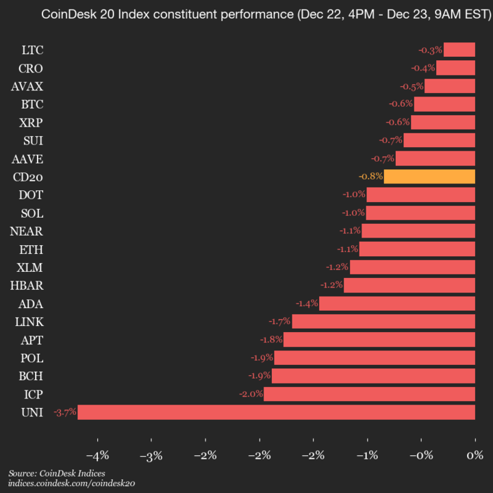 CoinDesk Indices presents its daily market update, highlighting the performance of leaders and laggards in the CoinDesk 20 Index.