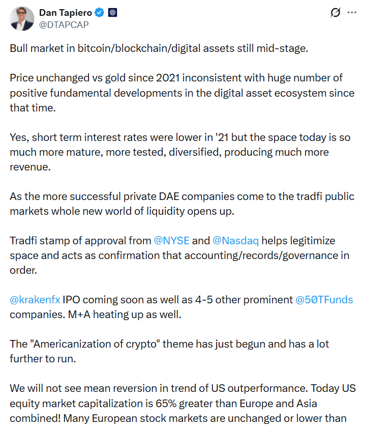 Still, Dan Tapiero, founder and CEO of 50T Funds, claimed that the Bitcoin (BTC) bull market is "still mid-stage.” He added that Kraken’s IPO and an increasing number of (M&As) may provide the necessary tailwinds to bring new capital from TradFi.