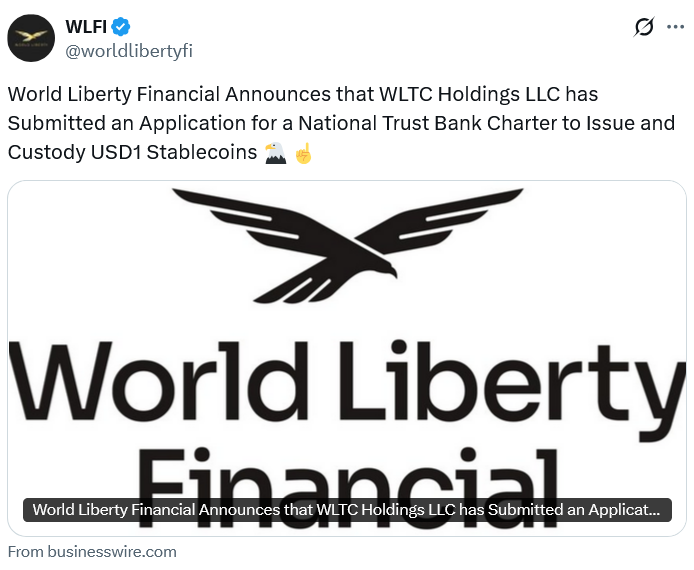 “Institutions are already using USD1 for cross-border payments, settlement, and treasury operations,” said World Liberty CEO Zach Witkoff. “A national trust charter will allow us to bring issuance, custody, and conversion together as a full-stack offering under one highly regulated entity.”