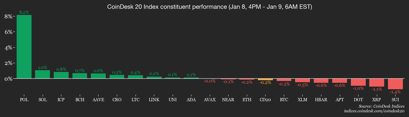 Except for solana SOL$137.91, which is up 2.8% over 24 hours, most majors, including XRP$2.0939, ether ETH$3,083.20 and BNB BNB$887.66, are little changed. The CoinDesk Memecoin Index (CDMEME) has gained over 8%.