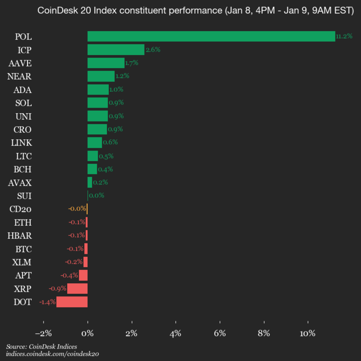 Laggards: DOT (-1.4%) and XRP (-0.9%).