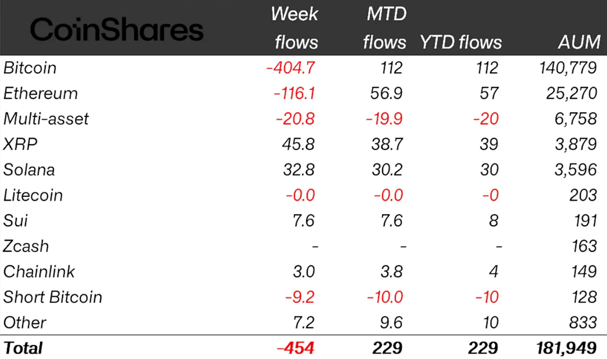 Crypto exchange-traded products (ETPs) saw $454 million in outflows last week, European crypto asset manager CoinShares reported on Monday.