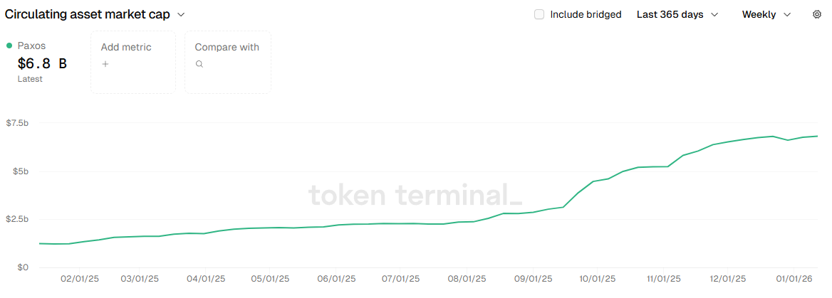 Over the last year, Paxos’ total asset valuation has grown to $6.8 billion from just $1.2 billion in January 2025, according to TokenTerminal.