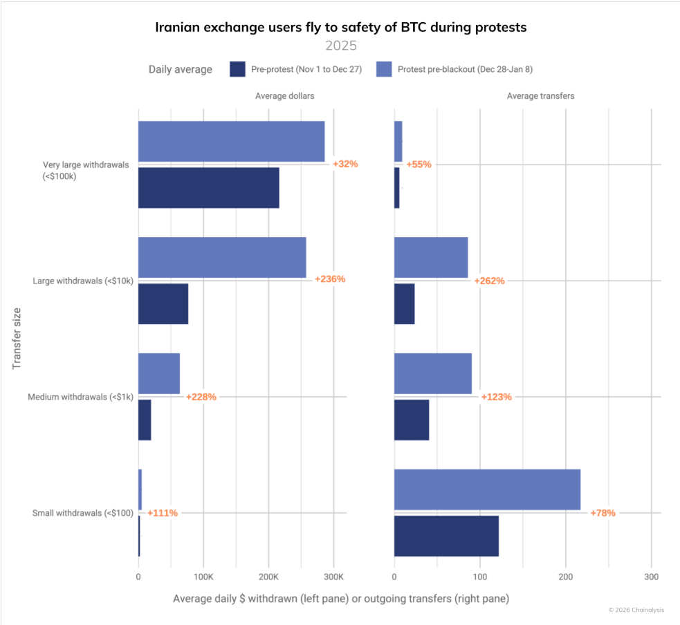 “Most telling is the surge in withdrawals from Iranian exchanges to unattributed personal Bitcoin wallets. This surge suggests Iranians are taking possession of Bitcoin at a markedly higher rate during protests than they were beforehand,” it said.