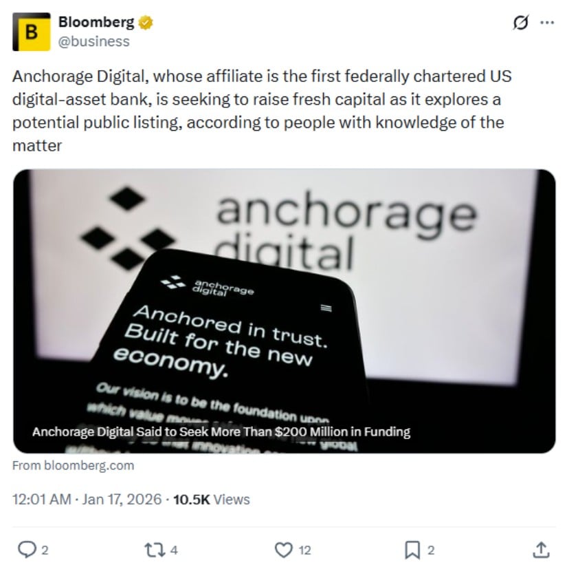 Institutional crypto platform Anchorage Digital is seeking to raise between $200 million and $400 million in fresh capital as it prepares for a potential initial public offering in 2027, according to Bloomberg reports from sources familiar with the matter. The company has not publicly confirmed these plans.