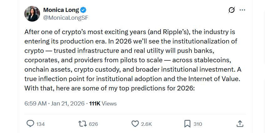 As part of her predictions, which also covered topics such as stablecoins, crypto custody, and artificial intelligence, Long said that blockchain is becoming the “operating layer of modern finance” and that 2026 will see a huge uptick in institutional adoption.