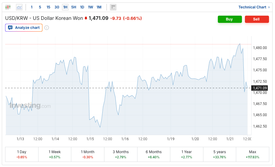 The won initially responded, strengthening from around 1,477 to 1,462 per dollar in the days following Bessent’s remarks. But the rally proved short-lived—by January 21, the currency had weakened back to 1,478, erasing most of its gains.