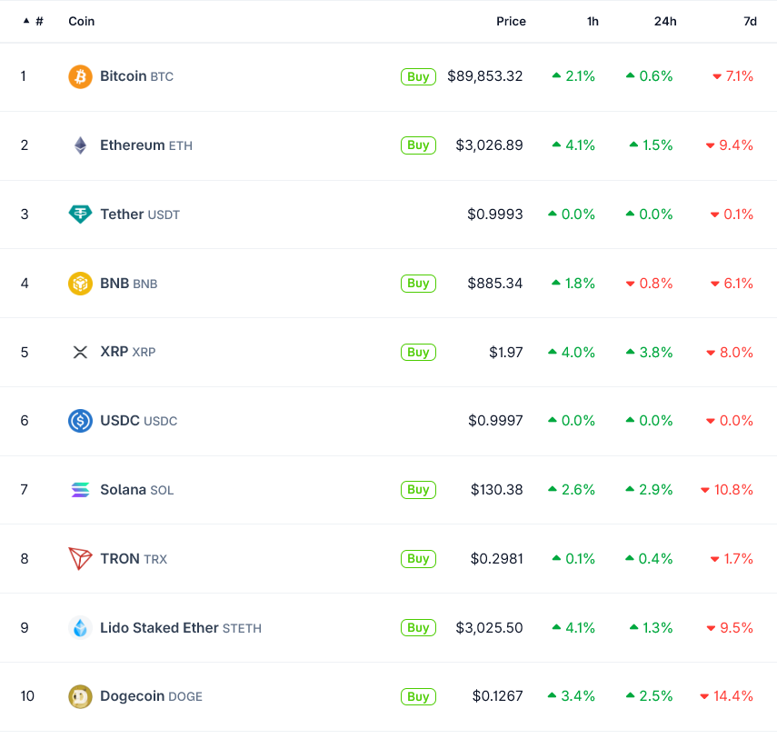 Bitcoin climbed back toward $90,000, recovering from intraday lows below $89,000, while Ethereum rebounded toward $3,000 after briefly slipping under that level. US equities also stabilized, with the S&P 500 turning higher following earlier losses. Gold, which had risen on geopolitical risk, pared gains.