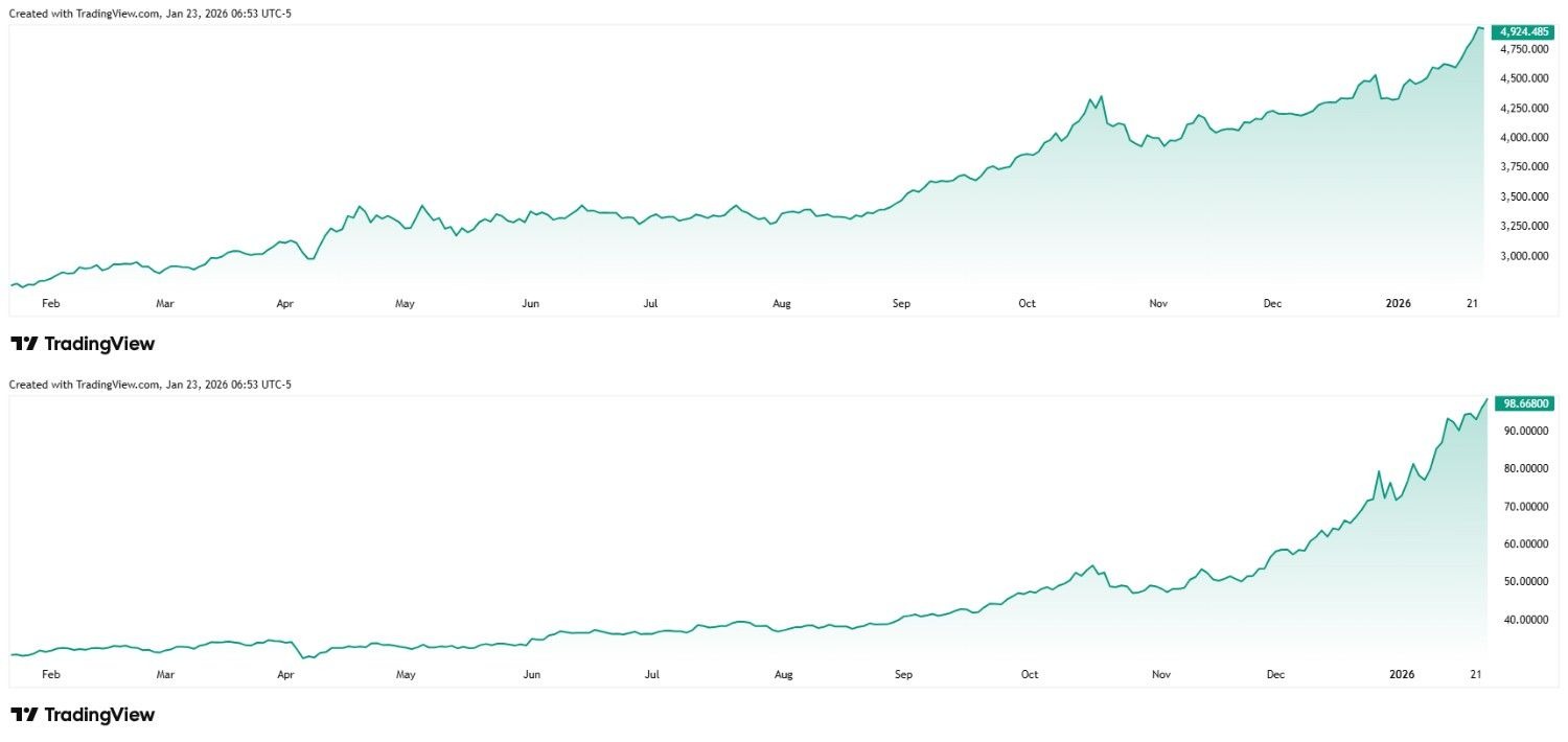 Indeed, a hypothetical gold Trump commemorative coin would have been worth $2,770 on January 20, 2025, and $4,933 at press time in 2026.