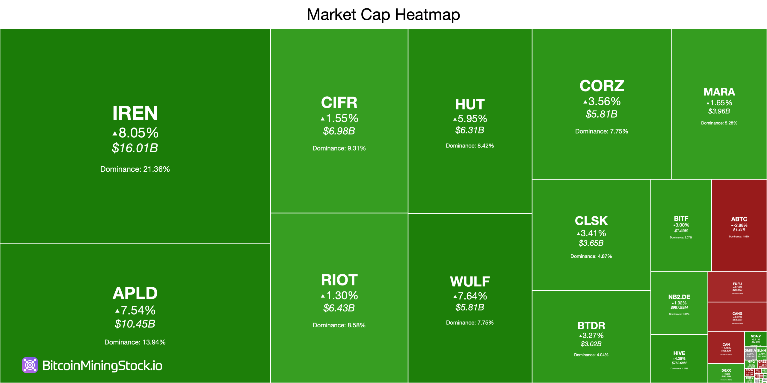 Mid-pack performers also leaned positive. Core Scientific rose 3.56% to $18.73, CleanSpark gained 3.41% to $13.64, and Bitdeer Technologies Group increased 3.27% to $14.50. Bitfarms added 3%, trading at $2.74, while Cipher Mining and Riot Platforms posted smaller but still positive moves of 1.55% and 1.30%, respectively.