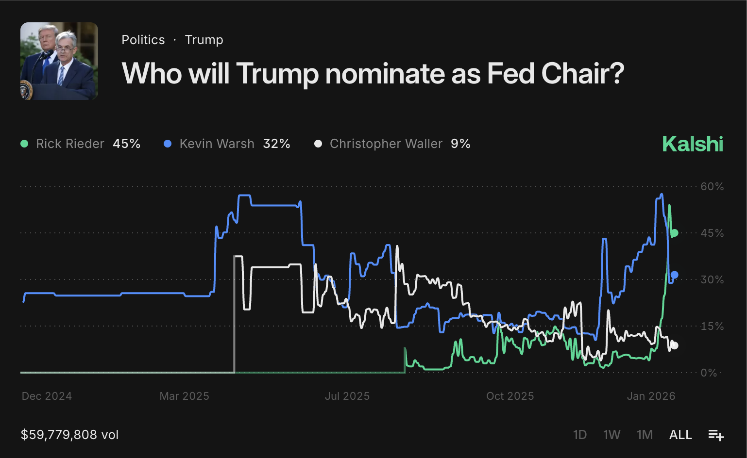 Rieder is currently polling strongly on prediction platforms. Markets on both Polymarket and Kalshi give him a 45% chance of securing the nomination, ranking him above other candidates such as Fed Governor Christopher Waller and former Fed official Kevin Warsh.